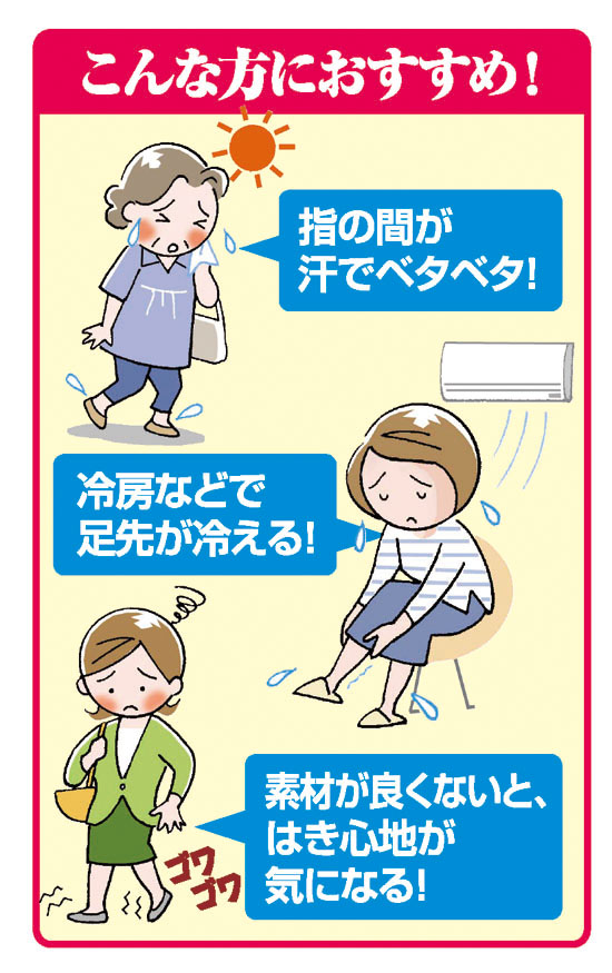 一度はいたらやめられない! 5本指靴下です、親指から小指までそれぞれの足指にグッと力が入るので、踏み込みやすく、歩くのがグンとらくに。また、指が分かれているので、これからの蒸し暑い季節も足先がムレにくく重宝します。さらに、はき心地のよい綿混素材を使用し、エレガントなレース編みを施しました。ファッション性も抜群で、夏のミセスの足元をおしゃれに彩ります。足元に視線が集まるウォーキングなどにはいて出かければ、きっと注目の的に。もちろん普段ばきにも欠かせません。透かし柄の編み毛様でパステル調のピンク、ベージュ、グレーの3色を3足ずつ、計9足組でお届け。はき分けが楽しめ、洗い替えにも便利です。