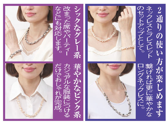 色合いや形状が多種多彩で2つと同じ珠が存在せず、天然の芸術と呼ばれるほど魅力的な "淡水パール" をふんだんに使用した、贅沢なジュエリーセットです。ネックレスとブレスレットは、それぞれ単品としてもお使いいただけますが、繋ぎ合わせればなんとロングネックレスに早変わり。留め具のマグネットをくっ付けるだけなので、その日の気分やお出かけ先などに合わせて気軽にアレンジが楽しめます。淡水パールをたっぷり使用したボリューム感と手間ひまかけた繊細で高級感のある作り込みも魅力で、身につけるだけでゴージャスな印象に。色は、ピンク系とグレー系のマルチカラー2色から選べ、その清楚で上品な色合いは、ふだん使いはもちろんフォーマルなシーンでも活躍します。これだけボリュームがありながら実現したお値打ち価格も注目ですので、ぜひお見逃しなく!
