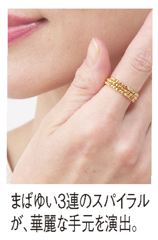 18金のビーズのような粒にダイヤモンドカットを施し、3連に仕上げたゴージャスなリングです。18金の粒は動くたびにミラーボールのような繊細な輝きを放ち、指元をより魅力的に演出。しかも3連なのでボリューム満点で、豪華な雰囲気に溢れています。リングはスプリングのような形の形状記憶合金なので、どんな指にもフィット。しかも、締めつけ感がないのも魅力です。色は、18金本来の色合いが楽しめる人気のイエローゴールドで高級感でいっぱい。指元にサッとお飾りいただくだけで心も華やぐ、大人の女性のためのリングです。