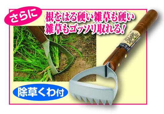 あっという間に生え、刈っても刈っても伸びる雑草。その度に腰に負担がかかり、腕など筋肉痛になったり…。そんなつらい草刈作業がラクに手早くできる日本製の確かな品質の器具セットです。「草刈かっちゃん」は、立ったまま作業できるので腰への負担が大幅に軽減。アームにバネがついていて、軽く腕を動かすだけでハサミが開閉して、雑草を面白いように刈ることができ、広い場所で長時間に及んでも腰・腕・脚が疲れにくく快適です。ます。これなら女性やお年寄りでもラクラク。刃部はサビにくく切れ味が長持ちします。「除草くわ」は、V字カットにより草が滑りにくく、しっかりスムーズに刈り取り。平刃とギザ刃が使い分けられ、頑固な雑草はギザ刃を根本に差し込んでごそっと根こそぎ抜くことができ、反対側の平刃でスイスイ土ならしできます。