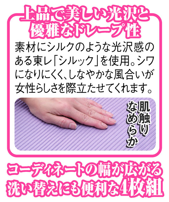 一枚で着たり、上にジャケットやカーディガンなどを羽織ったり、幅広く着回せるため何枚あっても重宝なプルオーバー。これは東レの「シルック」を混紡することで、シルクのような美しい光沢を持ち、格上の着こなしが楽しめる高級感あふれる仕上がりが魅力です。シンプルなシルエットながら、優雅なドレープ性としなやかな風合いがエレガント。衿・袖口・裾がメロウ仕様になっていてさらに女性らしい印象を与えます。凹凸のある素材は縦横に伸びて動きがラクにでき、シワにもなりにくく旅先の着替えとしてお持ちになっても便利。淡くきれいな4色をセットにしましたので、幅広く着まわしていただけ、一年中大活躍します。