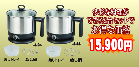 火を一切使わずに、沸かす、煮る、蒸す、茹でるの4役が、これ1台で出来る便利で安全な調理鍋です。熱源は電気なので、火の取り扱いが苦手になったご年配の方でも安心。インスタントラーメンや味噌汁をはじめ、煮物も安全に簡単に作れて重宝します。また、台所はもちろん、テーブルの上でも調理ができて、鍋物などを召し上がる際にも便利。さらに、保温機能付きで料理はいつでも温かく、鍋物や味噌汁が煮詰まる心配も不要です。電気ポットとしても使え、卓上で熱いコーヒーやお茶を飲みたい時にも活躍し、付属の蒸し網や蒸しトレイを使えば温野菜や温泉卵も作れます。しかも取っ手付きで持ちやすく、ガラス蓋は料理が見えて便利。こんなに使い勝手に優れてた鍋を2台!多彩な料理をお楽しみください。