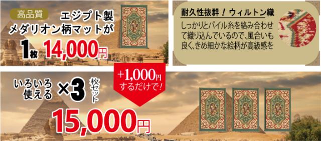 お客様を迎える玄関、また毎日使うキッチンや洗面台などを贅沢なマットでゴージャスに演出しませんか。これはかつて王侯貴族を魅了したウィルトン織のマットで、鮮やかに浮かび上がる古代ペルシャ王朝文化の栄華を感じさせるメダリオン柄。光沢がとにかく美しく、光の角度によって色柄に濃淡が現れ、いっそう高級感を漂わせます。パイルを元布にしっかりと織り込んでいるため耐久性も高く、長くご愛用いただける逸品。一枚で14,000円のところ、今回はわずか1,000円をプラスするだけで、この高級マットを3枚お求めいただける特別企画です。キッチンに、玄関に、ソファやベッドの足元にと家中で使えて大変重宝です。この機会を生かしてぜひお買い求めください。