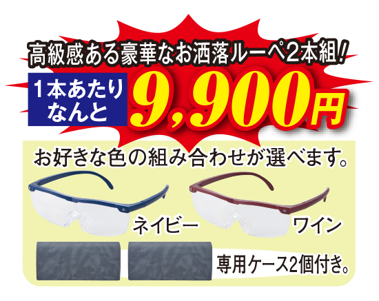 「小さい文字が見えにくい」「趣味の細かい作業がつらい」。そんな方に大人気のルーペが高級感あふれる天然石入りで新登場!左右の目元になんと天然サファイア2石をあしらい、高級感のある華麗な表情に演出しました。読書をしたり、手芸などをしたりする時も、気分が華やぎ楽しく充実した時間が過ごせます。また1.6倍の拡大率ですから、新聞の細かい文字や画数の多い漢字もはっきり読み取れます。かけても両手が自由に使える眼鏡型ですので、針に糸を通す時や趣味の作業もはかどります。しかも今回は、便利な2本組でお届け。2本あれば1本はお家専用に、もう1本は外出用としていつでもバッグに入れて持ち運べます。また、寝室やリビングなどお部屋ごとに置いても便利です。お値段は2本で19,800円!天然サファイア入りのルーペが1本あたり1万円を切った価格で手に入るチャンスは絶対に見逃せません!お好きな2色の組み合わせで今すぐお申し込みください。