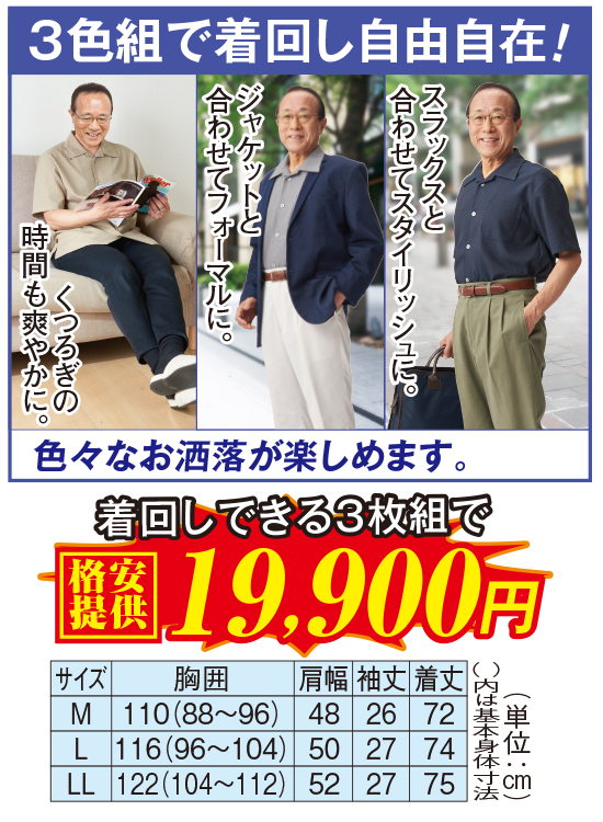 蒸し暑い夏でも涼しい顔でダンディに過ごしたい紳士にぴったりのシャツです。優れた通気性を持ち、吸水速乾性のある生地により、汗ばむ日の不快感を大幅に和らげてくれます。さらに凹凸のあるサッカー地ですから肌にベタつかず、いっそう爽やかな着心地です。カジュアルな中にもグレードを感じさせる、確かな品質の日本製。着回しが自在にできる3色セットが19,900円と、格安でお求めいただけます。スラックスはもちろんジャケットにも合わせられ、幅広いコーディネートをお楽しみいただけます。洗濯してもすぐに乾くので洗い替えの心配もありません。Tシャツではちょっと、という場面でも衿つきのシャツなら安心。暑い季節に大活躍すること間違いなしです。