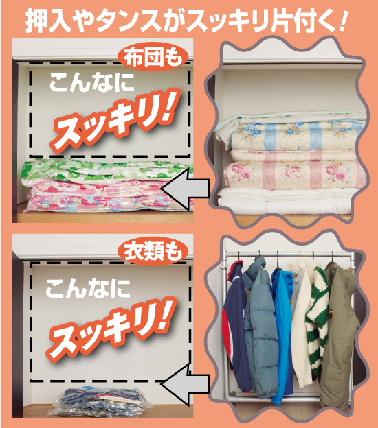 片づけが楽しくなる見た目に美しい花柄の圧縮袋のセットです。今や当たり前になった収納の省スペース術は圧縮すること。これはバルブに付属の電動の吸引ポンプをあててスイッチオンするだけの簡単操作で、一枚の厚みのある布団が見る間に圧縮されてスッキリ片付きます。同じように衣類専用の圧縮袋を加えたそれぞれ4枚ずつをセットに。さらに圧縮袋の中に入れて使える抗菌防臭防ダニシートが4枚、圧縮袋専用の電動吸引ポンプまでついた計1 0点組です。届いてすぐに使えて大変便利コロナ禍で在宅の機会が多く、整理や清掃が増える時には大活躍します。