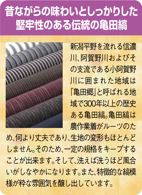 寒い冬に「肩や背中が冷えてしょうがない」といった経験をお持ちの方におすすめの商品です。こたつに入りながら着用したい半天と、便利なベストの2枚セットをご紹介いたします。伝統の亀田縞を使用した昔懐かしいデザインであり、昭和レトロな雰囲気がとてもおしゃれです。繊細で玄妙な縞模様が、高級感を感じさせると人気があります。こちらの半天とベストは耐久性のある木綿生地を使用しており、また中綿入りなのでとても暖かい逸品です。どちらも全体的にゆったりとした作りなので、とても楽に過ごせます。また共に前側にポケットが2コついており、近所ならちょっとしたお買い物にも使い勝手の良い商品です。洗濯機で丸洗いできるので、お手入れも簡単です。寒い日もゆったりくつろげる、こちらの半天とベストを是非お試しくださいさらに寒い日は、ベストの上に半天を重ね着するととてもあたたか。この2枚セットは冬に重宝します。
