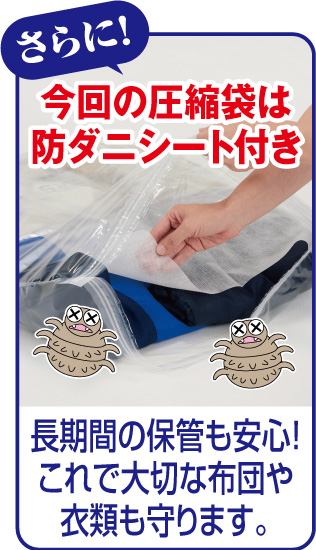 布団であふれかえる押し入れ、洋服ダンスもパンパン。そんな悩みはこれで解決。豪華布団圧縮袋オリジナル20点セットのご紹介です。布団がスッキリと収納ができると大好評の布団圧縮袋は布団なら4枚、毛布なら6枚を1枚の圧縮袋に収納できるから、パンパンだった押し入れがとてもスッキリ!さらに今回はなんと、専用の吸引ポンプをお付けします。専用ポンプはとてもパワフル。圧縮がラクにできます。お手持ちの掃除機を使う必要がないので衛生的にも安心です。衣類圧縮袋はかさばる衣類をコンパクトに収納。下着や靴下などは手巻き式圧縮袋にいれてクルクルと巻いて引き出しに並べれば見た目もきれいに収納できます。旅行バックの整理にも重宝です。吸引ポンプがついた圧縮袋のセットにさらに防ダニシート10枚をお付けした20点セットで、13,800円でのご提供!メーカー希望小売価格からおよそ7,100円引きの大変お得な限定価格です。今すぐお求めください。