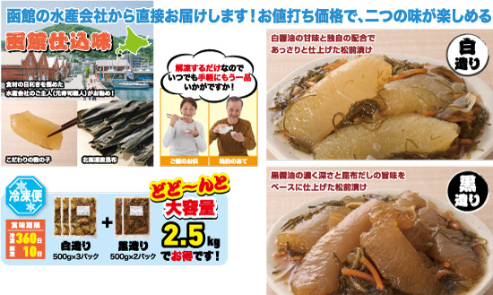 ●セット内容=白造り数の子松前漬け(500g×3パック)、黒造り数の子松前漬け(500g×2パック)のセット合計2.5㎏●原材料 白造り数の子松前漬:数の子(オランダ)、人参、昆布(北海道)、いか加工品(いか、砂糖、食塩)、食塩、かつお節エキス、しょうゆ、砂糖/ソルビット、調味料(アミノ酸等)、酒類、増粘多糖類、(一部に小麦・大豆・いかを含む)黒造り数の子松前漬:数の子(オランダ)、しょうゆ、人参、昆布(北海道)、いか加工品(いか、砂糖、食塩)、かつお節エキス/ソルビット、調味料(アミノ酸等)、酒類、増粘多糖類、(一部に小麦・大豆・いかを含む)●加工地=日本●賞味期限=上に記載