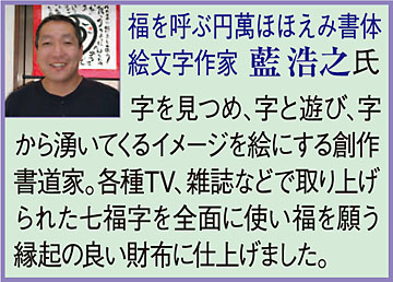 絵文字作家の藍浩之氏が七福神にちなんで、円萬ほほえみ書体と名づけた書体で、恵・愛・開・喜・豊・福・寿の七つの縁起の良い文字を全面にちりばめた七福字円萬財布です。使い続けていくことで七つの願いが成就し、円萬になって、たくさんのお金が集まってきますようにと願って作られました。円萬ほほえみ書体は字から湧いてくるイメージを絵にした独創的な文字で、これまでもお誕生記念、結婚祝い等で創作文字として喜ばれています。色は黄金色のシャンパンゴールド、風水ではラッキーカラーのイエロー、格調高いブラウンの3色をご用意しました。牛革製の使い勝手のよい財布で、カードやお札、小銭もたっぷり収納できます。