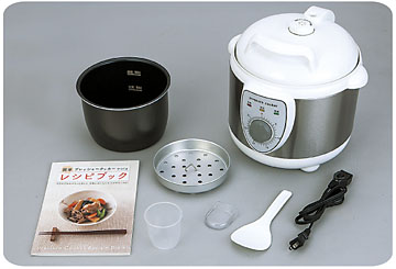 手間のかかる煮込み料理もアッと言う間に美味しくできる圧力鍋。お料理好きにはぜひ用意しておきたい便利な鍋ですが…蒸気を密閉するので、ヤケドや爆発事故の心配があって使いこなすのが大変。そこで重宝なのが、この電気圧力鍋です。電気釜と同じような仕組で、材料を入れてガチャンと蓋をするだけ!自動的に加熱・加圧してくれるので、むずかしい火加減調整はもちろん、普通の圧力鍋のようにつまみ蓋を上げ下げして蒸気を抜くような危険で面倒な作業も一切ありません。火を使わないので火災の心配もなく安心です。ご年配の方でも安心してお使いいただけます。炊飯器が故障したときは、ごはんも炊けます。50種類もの調理例を載せた豪華レシピブック付きで、15、800円のお求めやすさも見逃せません。