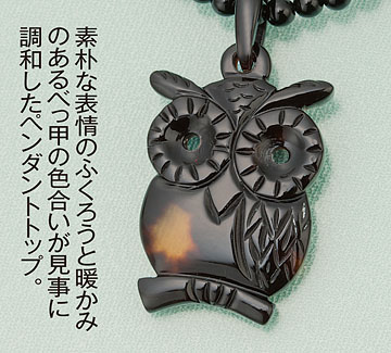 福がこもる「福籠」、苦労をなくす「不苦労」など、古来より縁起のよい鳥として崇められてきた「ふくろう」の飾りをトップにした、おしゃれでかわいいペンダントです。飾りの「ふくろう」は、長寿の象徴であるカメの甲羅のべっ甲を使い、丹念に彫り上げました。幸せへの祈願を込めた、大変おめでたい逸品です。ネックレスは、上品な漆黒のオニキスを主珠とし、アクセントとして琥珀をあしらいました。コントラストの利いた配色で、着ける方の胸元を美しく彩ります。全体に落ち着いた色調で、お手持ちのファッションとも合わせやすい重宝なペンダントです。