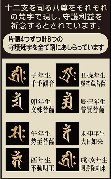守護と繁栄に願いを込めてお飾り頂ける美術刀のご紹介です。研ぎ済まされた刀身に浮かぶ「乱れ波紋」が、邪気を一閃にて断ち切れそうな「霊剣八尊守護梵字刀」は熟練の刀剣職人の手によって謹製された名品です。漆黒の鞘に片側、4つずつ八尊の梵字全てが刻印されています。蒔絵により印された黄金の「梵字」は古来より仏法の霊的な神聖文字として崇められ、十二支を司る八尊をそれぞれの梵字で表し、守護と利益を祈念するとされています。古来より刀は御守りとして災難を払うものとして扱われ繁栄等の願いを込めて飾る風習があります。専用の掛け台付きですので、慶事や引っ越しのお祝い等に床の間に飾ったりと、和風インテリアとしても最適です。