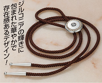 家族、親族が見直されている時代。先祖代々の深い絆を象徴する、家紋に注目が集まっています。その大事な家紋をお洒落なループタイに付けました。脇石に28石のジルコニアを施し、その輝きに包まれたように、中央にわが家の家紋が煌めく堂々たるデザイン。一家の主の貫禄を示す、風格あふれる逸品です。普通のネクタイと違い、着けるのもラクラク。スライド式で簡単に長さ調整できます。
