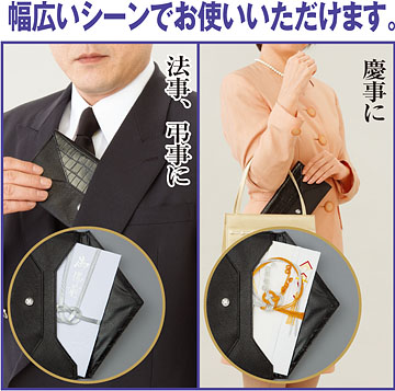 慶弔のシーンで欠かせない「ふくさ」。布製が一般的ですが、これはなんと牛革を贅沢に使用した高級感あふれる「ふくさ」です。このふくさの特徴は牛革のもつ豪華さと美しい質感をたたえた瀟酒で、魅力的な雰囲気。あなたの家紋をお入れしますので、さらなる格調高さを演出いたします。シックな黒が醸し出す凛とした表情の中に、一部クロコダイル型押しを施すことで変化のあるデザインに。法事、弔事、慶事と幅広いシーンでお使いいただけ、これひとつお持ちになると大変重宝です。しっかりとした造りですから中身の慶弔袋が折れたりシワになったりする心配もありません。牛革は丈夫で長くお使いいただけ、使うほどにツヤを増し、何とも言えない深い味わいへと変化していきます。35種類の家紋からご指定の上、ぜひあなたも申込みください。