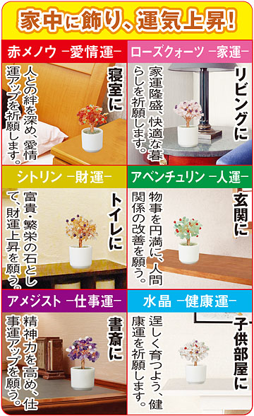 大きな災害や事故が続く今日この頃。こんな不安な時代だからこそ、厄を払い福を招く中国古来の風水学のなかでも特に霊験が高いといわれる、貴石で作られた盆栽「富貴樹」をお役立てください。今回ご紹介するのは、風水学の生命線ともいうべき色と方角に応じて、家の中の最も効果的な場所に置ける6個のミニ「富貴樹」です。仕事運を拓くとされる紫のアメシスト、健康運を司る白色透明の水晶、黄色のシトリンは財運を、緑のアベンチュリンは人運を好転させるといわれています。さらに、愛情運を高めるという赤メノウ、家運を隆盛させるというローズクォーツの計6個で、色とりどりの貴石により、家中に花が咲いたような明るさが生まれます。飾る場所は、仕事運なら東の方角、健康運は南西、財運なら西がよく、人運は南、愛情運は北、家運は健康運と同じく南西と、それぞれの運気によいとされる方角に飾ることで、より強い開運祈願となります。ぜひお試しください。