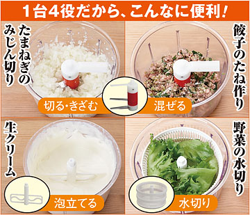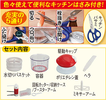 適当な大きさに切った食材を入れて、蓋をしてハンドルを繰り返し引くだけ。電気を使わないので経済的です。二枚刃タイプなので素早くみじん切りができ、引く回数によって仕上りの細かさを調節が可能。他にも野菜の水切りができ、サラダが水っぽくならず美味しく仕上がります。また揚げ物の油切りをしてカロリーを抑えることもできます。他にも餃子のあんや魚のつくねなど、材料を刻んで混ぜ合わせたり、生クリームなどを泡立てたりするのも簡単。保存用の蓋も付いていますから、刻んだり混ぜた食材をそのまま冷蔵庫で保存したいときも重宝です。今回、包丁を使わず食材が切れて便利なのはもちろん、栓抜き、瓶などのふた開け、缶開け、魚のウロコ取りまでできる多機能タイプのキッチンばさみもセットしてお届けします。