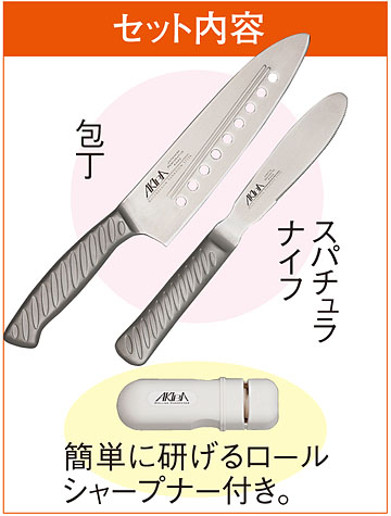 切れ味の秘密は、モリブデンバナジウム鋼にあります。硬いかぼちゃや、魚を骨ごとでも力を使わずにラクに切断でき、完熟のトマトも実を崩さずにスパッと美しい切り口に。丈夫で刃こぼれしにくいので切れ味が長持ちします。しかも刃部にあいた穴が食材のひっつきを防ぎ、凸状のラインを二本いれることで刃離れが良く、胡瓜などもスパスパと気持ちよく切れます。さらに刃部分と柄の間に継ぎ目がない一体構造なので、汚れがこびりつきにくく洗い落とすのも簡単で清潔。柄が取れる心配もありません。今回は、食材にしっかりくいつくギザギザ刃形状でパンなどが切りやすいスパチュラナイフ、さらに包丁の刃をサッと通すだけで研げる便利なロールシャープナーをお付けした豪華3点セットで一万円を切る価格を実現しましたので、ぜひこの機会にお買い求めください。