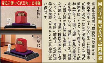 古来より大変縁起が良いダルマの置物は家に飾ると幸せをもたらすと言われています。室町時代に日本に伝わった仏教禅宗では、達磨大使という僧侶を重要視し、「祖師」の言葉は達磨を表すこともあるほどです。また、開運・招福の縁起物として人気が高く、現代社会で様々な悩みを持つ人の心の支えとなることを願って富山県高岡市特産の伝統工芸品、高岡銅器の熟練職人によって作られました。「円満」欠けることなく満たされ、角がなく福々しい心と、安定感が何ものにも動かされない「不動」の心を表すダルマを、ずっしりとした鉄製の重厚感と高級感で仕上げているのも魅力です。開運・招福はもちろん金運アップにもつながるインテリア置物として最適です。ぜひお買い求めいただご家庭の繁栄と幸福をご祈願ください。