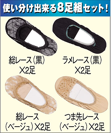 夏の足元は、素足にパンプスがいちばんですが、困るのが足裏から出る汗。靴の中がムレて、ベタついて、ニオイがついて、不快で不衛生。そこでおすすめしたいのが、このパンプスカバーです。足裏に綿100%の汗取りタオルマットを付けました。足裏から出る汗を吸収するのでムレにくく、ベタつきにくくなり、とても清潔。綿100%ならではの爽やかな肌ざわりが楽しめます。さらに、つま先とかかと部分はクッション材入りで、はき心地は快適。おしゃれなレースをあしらった、女性らしいデザインも魅力です。パンプスの色やデザインに合わせて使い分けできる、黒とベージュのタイプ違いで合計8足組でのご提供。毎日はきかえて、お使いいただけます。