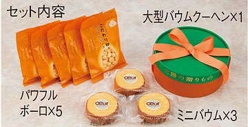 お年寄りからお子さままでみんな大好きなバウムクーヘンとボーロのセットです。ビタミン・ミネラルが豊富な餌を与え、安全安心の環境で大切に育てた鶏が生む新鮮な卵だけを使用した、ひと味違うこだわりのおいしさ。大型のバウムクーヘンには生クリームを使用することで、ふんわりとした食感とコクがあり深い味わいに仕上げました。マイスターと呼ばれる一流の職人が、一層一層丁寧に焼き上げた贅沢な美味しさ。パワフルボーロは、口溶けがよく、昔懐かしいやさしい味わいが口に広がります。気軽に食べられる、食べきりサイズのミニバウムもセットしました。いずれも合成着色料などの添加物は一切使用していませんので安心してお召し上がりいただけます。おやつに、お客様のおもてなしに、またご進物にもぴったりです。