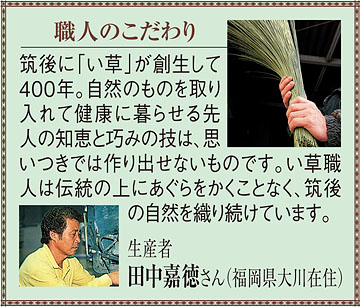 熊本県八代地方で栽培された「い草」を筑後地方で織り上げた、生産者の顔がわかる「い草」ラグをご紹介します。栽培から、染め、織り、仕上げまで国産にこだわった、純国産の「い草」ラグです。袋織という良質な国産「い草」を大量に使って織り上げる二重織りの技法で、細やかで華やかな花柄を表現しました。丈夫で踏み心地の良いのも特徴です。裏に不織布を貼り、すべりにくく弾力性良く仕上げました。フローリングでも畳の上でも快適にお使いいただけます。ひんやり、さらりとした触感が気持ちよく、清々しい香りが爽やかな「い草」は天然のエアコンと言われるほど調湿効果に優れていて、高温多湿の日本の夏を過ごしやすくしてくれます。爽やかで繊細な花柄「い草」のラグで快適な夏をお過ごしください。