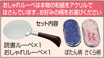 見づらい、見えにくいと思ったらすぐに取り出せるルーペです。読書ルーペは今までの普通のルーペは細かな文字を読む時にレンズのフチが気になることがありましたが、こちらのルーペはフチがないので読みやすく、軽くなりました。対象物から約45cm範囲はピントを合わせ不要なので動かしながら一気に新聞等が読めます。おしゃれルーペは、コンパクトで携帯に便利。レンズをだすとLEDライトが自動点灯。、買い物時、値札などの細かい文字もハッキリ見えます。いざという時に懐中電灯になります。おしゃれな和紙をはさんだ柄は2種類あり、お好みの色をお選びいただけます。是非この機会を逃さずお買い求めください。