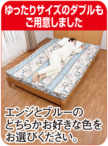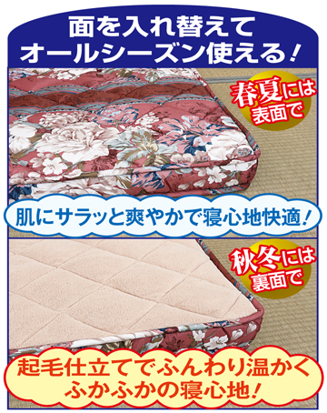 なんと厚さが約10㎝もある極厚の敷き布団です。これだけ厚いと、下にマットレスを敷かなくてもふかふかとした極楽気分の寝心地。布団の上げ下ろしもこれ一枚ですみ、ラクに手早くできます。中わたの中央に硬わたを挟んだ3層構造で、ふかふかなのにしっかりと身体を支えて腰への負担を軽減。ヘタリが少なく、長い間ご使用いただけます。また片面が起毛素材になっていてふんわり暖かく秋冬にぴったり。厚さがあるので床からの冷気を伝わりにくくします。もう一方の面はサラッと爽やかな触感の素材で、春夏におすすめ。表裏使い分けられ、真冬の冷え込む夜は温もりに包まれ、真夏の寝苦しい熱帯夜も爽やかにと、一年中快適におやすみいただけます。シングル2枚組、とダブル1枚からお選びいただけ、シングルはエンジとブルーの2色セット、ダブルはエンジかブルー、どちらかお選びください。