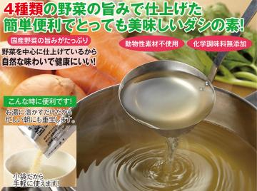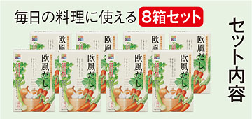 たまには洋食を、と思ってもスープ作りから始めるとなると、わが家ではとても大変。そこで重宝するのが、この欧風だしです。ビーフやポーク、チキンなどの動物性素材は一切使用していませんので、臭みが苦手という方にも安心。化学調味料も使わず、野菜特有のやさしい美味しさ、自然な味わいが特徴です。顆粒状で少量でも使いやすい5g 入りの小袋になっていて、ロールキャベツやリゾット、ホワイトシチューなどに、手軽にお使いいただけます。また、そのまま湯に溶かすだけで、美味しいスープにもなります。1箱32袋入りを8箱セットまとめてのお届けで、買って持ち帰る大変さもありません。ぜひこの機会にお求めください。