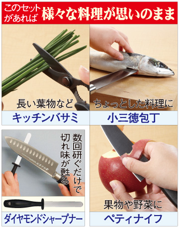 名刀の代名詞とされる正宗。その名を冠して岐阜県関市の熟練職人が自信をもって生み出した濃州正宗作のチタンコーティング包丁セットです。チタンをコーティングすることで、サビに強く耐摩耗性があり、鋭い切れ味が長続き。さらに刀身にくぼみ(ディンプル)を施すことで食材の切れ離れを良くし、調理の効率もスムーズにします。いやな金属臭もなく、汚れや臭いも残りにくいのでとても衛生的です。固いカボチャや柔らかいトマトもきれいにスパッと切れる三徳包丁。小魚などちょっとした料理に便利な小三徳包丁。野菜や果物に重宝なペティナイフに加え、フタ開け付きの使いやすいチタンコーティングキッチンハサミをセット。刃が分解できるのでお手入れも簡単です。切れ味が鈍くなったらダイヤモンドシャープナーでサッと軽くこするだけでOK。女性の方でも簡単に研げて、長くお使いいただけます。