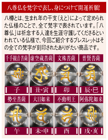 水晶に宿る八尊仏様の神聖な梵字と多彩な輝石パワーが、心身を守り開運へと導く崇高なブレスレットです。干支の生まれ年を見守りくださる八尊仏様の梵字を、8つの水晶に刻印。限りなく透明で美しい水晶に浮かび上がる梵字から、いつでも八尊仏様に包み込まれ見守られているような、安心感と幸福感を得られます。また、水晶と水晶の間には、金運や仕事運を高めると言われるタイガーアイや、集中力を高めるとして知られるルチル、精神と肉体に安定をもたらすとされる茶水晶など、様々なパワーを持つ美しい輝石を散りばめました。このブレスレットを肌身離さず身に付けて、さらなる開運を祈念してください。きっと新たな力と勇気がみなぎってくることでしょう。