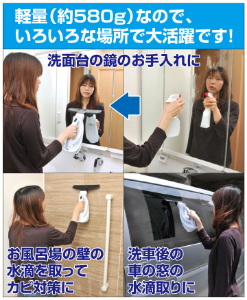 窓掃除が楽々にできるバキュームクリーナーです。ワイパーヘッドが汚れを水ごと吸い込んでピカピカに。冬の寒い時期に、水を張ったバケツや雑巾を用意して窓拭きは大変ですよね。そんな時はこのバキュームクリーナーで簡単に窓掃除が出来ます。軽量設計ですので女性にも片手で扱えます。電池式なので充電する事もなく、すぐに使用出来るので、汚れが気になったらすぐに掃除が出来ます。結露対策にもバッチリ。窓露を集め、同時に掃除が出来てしまう優れものです。電源コンセントが不要なのでお風呂場の水滴取りや野外でも使用でき、洗車後の車の窓の水滴取りにも使えます。吸い込んだ水はワイパーヘッドを外して捨てるだけ。便利なバキュームクリーナーを是非この機会にお買い求めください。