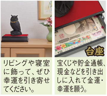 古来より霊力を持つ鳥として信仰されてきたフクロウ。朗らかに福を呼ぶ「福来朗」、苦労知らずの「不苦労」、福がこもる「福籠」、苦労しらずで老いる「不苦老」などと縁起の良い当て字も多く、幸運を呼び運気を上げる鳥として親しまれてきました。さらに首がよく回り夜目も利くことから、先を見通して商売繁盛・金運アップにも通じる金運鳥としても知られています。この「幸運を呼ぶ福来朗」は、その大きな瞳とふくよかな姿で豊かさを象徴している愛らしいフクロウの置物。首には金運・財運アップを祈念して、商売の繁盛と豊かな富をもたらす幸運の石といわれる黄水晶と、金運や仕事運を高め成功をもたらす石として珍重されている黄金虎目石を配したネックレスをしています。台座は引出し付きで、宝くじや通帳、印鑑などを大切に保管できる宝当箱になっています。金運鳥フクロウの御利益で大切な資産を守り育ててくれることでしょう。この縁起がよく福々しいフクロウの置物をリビングや寝室などに飾っていただき、貴家にさらなる幸せと財運をお招きください。