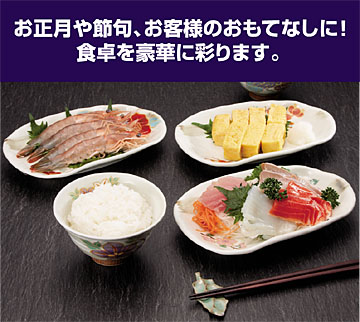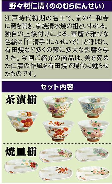 陶磁器ファンなら、その名を耳にされたことがあるかも知れません。江戸初期の名工、野々村仁清の華麗な作風を現代に甦らせた、仁清風絵変り有田焼の茶漬揃と焼皿揃のセットです。有田焼ならではの清楚な白磁に、雅びな色絵「仁清手(にんせいで)」を模し、冬から春、春から夏へと季節の移ろいを感じさせる椿、梅、桜、桃、紫陽花をそれぞれ絵付けしました。器から花の香りが、季節の匂いが、つたわって来るような見事な出来映えです。普段からお使いになってもよろしいのですが、お正月や節句など特別な日のお献立や、大切なお客様のおもてなし用にお出ししても立派に目を惹きます。