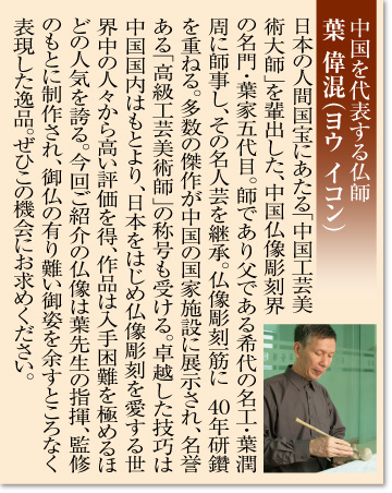 日本の仏教は中国伝来のもの。その本場中国における仏像彫刻の名門・葉家の五代目が特別に制作に携わった、有り難い木彫りの御仏像です。香り高く美しい木肌を持つ最高級材の天然檜を用い、一体一体精魂込めて手彫りで仕上げた、美術的価値も高い逸品。ご先祖様を永久にご供養し、貴家の繁栄を末長くご祈念いただけます。さらに、九体の御仏像それぞれの御手には、大珠の水晶が載せられ、清浄な光を放っています。古来より水晶には、無限の霊力が宿るといわれ、それを敬う者には生涯の幸せと金銀財宝がもたらされるとも伝えられてきました。この機会にぜひ一体お求めになり、御本尊の功徳と相まった大いなる開運をご祈願ください。