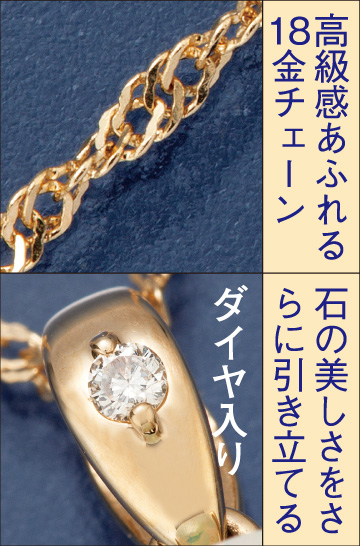 数ある宝石の中でも、独特な美しさから年配の方に人気のオパール。光の加減によって様々に色を変化させることで虹色石と呼ばれています。その幻想的な色と輝きを持つオパールにオーバルカットを施すことにより、さらに煌めきと美しさを増したペンダントです。大粒1.2カラットの石を使用し、色と輝きがさらにクッキリし、存在感はひときわ。石言葉は「希望、無邪気、潔白」で想像力や直感力を引き出してくれるといわれます。胸元で揺れるたびにキラキラと鮮やかに色を変え、神秘的な美しさを演出します。台座・チェーンは18金製で、きらっと輝くダイヤをあしらい、さらにゴージャスに仕上げました。飽きのこないシンプルなデザインと大きさですからいつも身につけられカジュアルからフォーマルまで幅広くお付けいただけます。