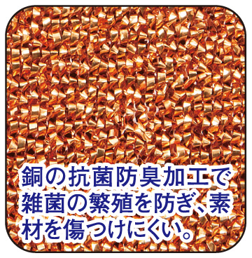 使い道や使う場所に応じて使えるループ、スポンジ、タワシの12個セットです。銅を練り込んだ雑菌の繁殖を防ぐ抗菌防臭加工により、いつも清潔にお使いいただけ、ぬめることもありません。また、素材を傷つけない加工を施していますのでステンレスやホーローはもちろん、ガラスや陶器からテフロン加工品まで様々な汚れをスッキリ落とします。銅微粒子がクレンザーの役目をするので少量の洗剤でOK。ループは薄くて使いやすく食品や鍋、フライパンに。スポンジはキッチンももちろん、お風呂の湯アカやタイルの目地などのお掃除にも最適です。タワシは焦げついた鍋やまな板など頑固な汚れにも対応。汚れ落としの作業がグーンとはかどります。