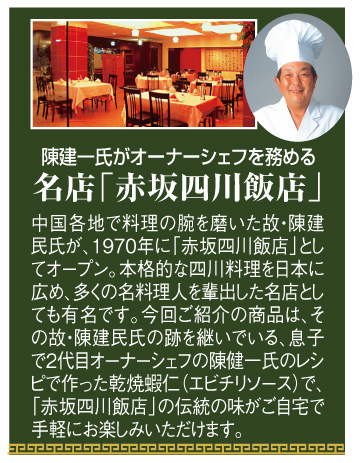 本場・四川の伝統の技に裏打ちされた、本格的な中華料理で人気を集める陳建一氏が監修。氏のオリジナルレシピを再現した乾焼蝦仁(エビチリソース)丼の具のご紹介です。丁寧に下ごしらえをして湯通ししたプリップリのエビを香ばしく炒め、1年未満熟成の若い豆板醤で整えた、色鮮やかでシャープな辛味が特長。陳建一氏がオーナーシェフを務める「赤坂四川飯店」伝統の溶き卵を仕上げに加えてあるので、ピリッとした辛さの中にもまろやかな味が楽しめます。エビの甘みとチリソースの辛味も絶妙で、一口味わうごとに至福の気分にひたれます。作り方はとても簡単で、冷凍のまま湯煎するだけなので大変便利。食べたい時にすぐに作れて重宝します。アツアツのご飯との相性も抜群で、サッとかけるだけで豪華で贅沢な丼がご堪能いただけます。
