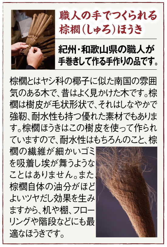 棕櫚の天然素材から手作りでつくられた、こだわりの掃除道具。ほこりが目についた時、サッと使える、時間を気にせず掃除ができる「ほうき」の良さが見直されています。今回は片手でサッとお掃除できる小ぼうきの棕櫚ほうきと、紙に柿渋塗りを施し、抗菌・消臭効果を図ったちりとり。そして吸水性に優れた甘撚りの糸を使った和紡ぞうきんの3点セットをご紹介いたします。しなやかな天然棕櫚のほうきは掃除機が届かないような場所や書斎などの卓上の掃除にもぴったりですし、ちりとりなども、よく見るプラスチック製とは違う天然素材で作られた趣のある一品。そして、使う用途を考えて、吸水性を高めるために、素材から考えられた雑巾。見た目だけでなく、機能的で実用的な、そんな便利で手軽に掃除ができる洒落たお掃除セットです。