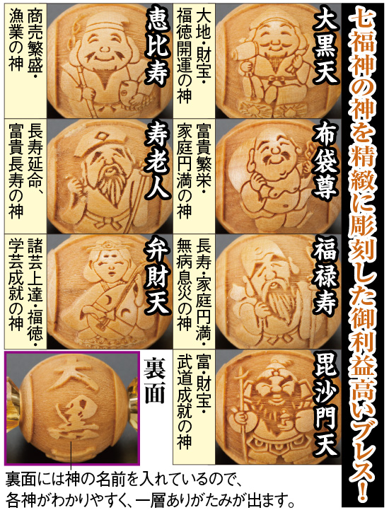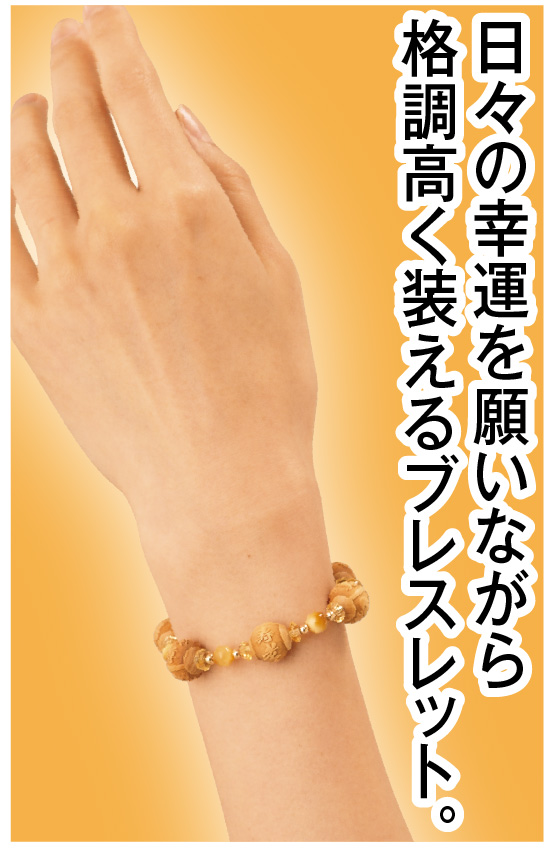 大黒天、恵比寿、布袋尊、寿老人、福禄寿、弁財天、毘沙門天の七福神。古くから「七難即滅、七福即生」と伝えられるように、七福神を神奉すると災難が除かれ、あらゆる幸福を授かると言われています。一年の始まりに参拝すれば、不老長寿、商売繁盛、五穀豊穣、家内安全など所願成就のご利益があるとの言い伝えも。そんな七福神巡りが、まさにお手元でできるありがたいブレスです。日本の職人が印鑑などで知られる高級つげ材に、神の姿と名前を精緻に彫り上げた逸品。金財運を向上するとされるゴールド虎目石と黄水晶で繋いでいるので見た目にも荘厳で、男女を問わず着けやすい色合いも魅力です。つげ材は軽くてひんやりしないのも冬に嬉しいポイント。ぜひ肌に身につけ、大開運をご祈願ください。