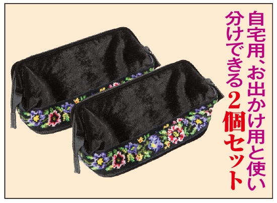 ヨーロッパの伝統の織物としてその繊細で優美な織りと豪華な仕上がりの定評のあるシェニール織りの化粧ポーチです。持ち運びしやすいサイズで、開閉口の縁にワイヤーを入れていますので、ガバッと開いて収納はスムーズ。ポーチを開いたままメイクができます。約8cmのマチ付きで、化粧品が多くてもたっぷり収納。6つのポケットには少し大きな化粧ボトルやブラシからリップスティックなどの小さな化粧品までスッキリ収納、きちんんと整理整頓できます。2個組なので一つは自宅に置いて、一つはお出かけ用として便利に使い分けることができます。