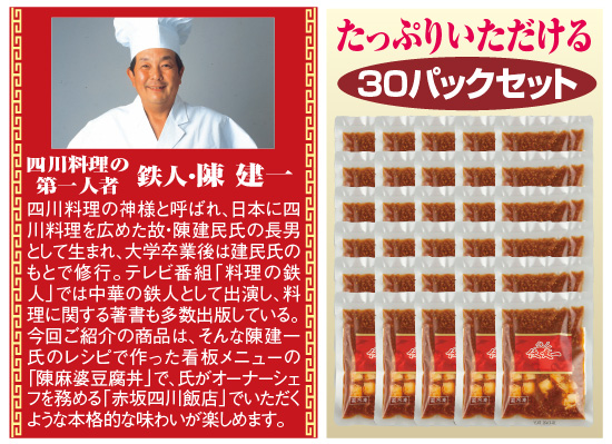 四川料理の名シェフの本格的な一品が、簡単調理で味わえる人気商品のご紹介です。ご用意したのは、テレビ番組などでおなじみの中華の鉄人、陳建一氏の独自のレシピで作った絶品の麻婆豆腐。中国・四川省から取り寄せた3年熟成の豆板醤を使ったソースは、ピリッっとした辛さの中に豊かなうまみとコクがあり豆腐との相性も抜群です。しかも、香り高いラー油やしびれる刺激の花椒(ホワジャオ)を使うなど、一切の妥協を許さない本格派。湯煎で温めて熱々のご飯にかけるだけで本場の麻婆豆腐丼が手軽にいただけます。少量食べ切りサイズでムダがなく経済的で、麻婆ラーメンや麻婆やきそばなどにアレンジできて活用範囲が広いのも魅力。今回は、ドドーンと30袋をまとめてお届けいたしますので、ぜひご夫婦やご家族で、陳さん渾身の味を心行くまでお楽しみください。