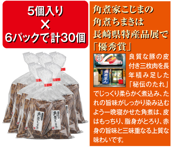 古くは中国から伝わり日本風にアレンジされた角煮は、その素材と製法を受け継ぐ長崎の郷土料理。「角煮家こじま」の角煮は、良質な豚の皮付き三枚肉をじっくり煮込み、皮はもちもち、脂身はとろとろに仕上げ、深みのある味は甘すぎず辛すぎず程よい味わい。そしてあっさりとさっぱりとした上質な味と豚肉本来の赤身の旨味、脂身の甘みは、その製法と味付けにあります。割烹料理店「こじま」の熟練の技と秘伝の角煮だれでじっくり煮込み、たれの旨味がしっかり染み込むよう一晩寝かせています。このこだわりの角煮をさいころに切って、炊き上げたもち米に秘伝の角煮だれと合わせて混ぜ込んだのが、今回ご紹介の「角煮ちまき」です。長崎県特産品展で「優秀賞」受賞の逸品です。一口サイズで食べやすく、小腹の空いた時もすぐにいただけます。常温で90日保存できますので、災害時にも役立ちます。たっぷりの30個入りでお届けします。