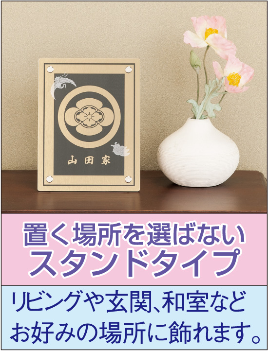 代々受け継がれた家紋は名前が有る今でも家の歴史と伝統を伝えるという大きな役割を持っています。でも家紋を知ったり、見る機会は冠婚葬祭ぐらいですが、家紋を大切にする家は、ご先祖の御霊が守り、末長い家運隆盛をもたらしてくれるといわれています。この家紋飾りは黒地に荘厳に輝く家紋と真下に刻まれた貴家の家名。古来より健康長寿、吉祥の象徴として尊ばれる鶴亀が貴家の家紋を守るように配されています。貴家に吉祥・家運安寧を末長く授けてくれるとされる家紋飾りです。スタンド式ですのでリビング、応接間、玄関、和室に場所を選ばず飾れます。また新築や改築などの贈答品などにも喜ばれます。ご購入の際は家名と家紋表の2ケタの数字をご記入ください。