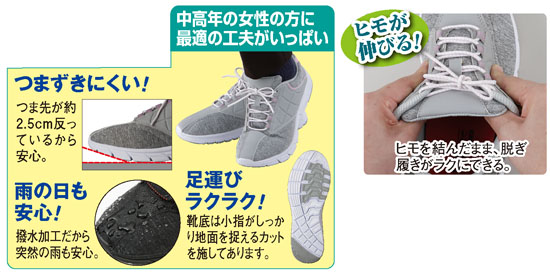 毎日のウォーキングやレジャーなどで大人気のスニーカー。でも、いちいちヒモを結んだりするのが面倒という方に、ぜひおすすめしたいのがこの便利なスニーカーです。ヒモに使用したのは伸縮性のあるゴム混紡素材なので、結ぶ手間がいらず、履き口をグーンと開いたまま履けるのでご年配の方は特に重宝します。しかも、片足分200gと軽く、屈曲性にも優れ、歩きやすさ抜群。靴底は地面をしっかりと捉える設計なので、足腰の弱い方でも快適な歩行が楽しめます。また、インソールは厚みがありクッション性に富む高反発インソールを使用しているので、足首や膝、腰に負担をかけず安心して歩けます。さらに、つま先を上に反らせ、小さな段差などでのつまずきを防止。表面には撥水加工が施され、雨や汚れを弾いてお手入れ簡単です。お得な2足組をこの機会に、ぜひお買い求めください。