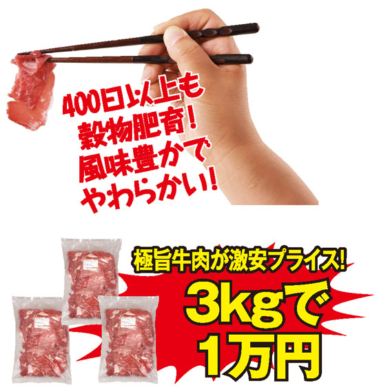 牧畜王国のオーストラリア牛と国産和牛の掛け合わせから生まれた、美味しい交配牛を使用。日本の精肉店でスライスした、安心上質な切り落としです。400日以上もの穀物肥育で丹念に育てた、臭みがなく風味豊かでやわらかな肉質が特徴。それがなんと3kgで10,000円ちょうどという、上等な肉質からは信じられない、切り落としならではの超お得な激安プライスも大きな魅力です。いろいろな料理に使いやすいスライスカットで、バラバラに凍結されていますので、必要な量だけ取り出して解凍・ご使用いただけます。焼き肉やビーフカレー、肉野菜炒めにはもちろん、切り落としといっても肉質は高級品と変わりありませんので、すき焼きやしゃぶしゃぶも絶品の美味しさ。超お得な極旨牛肉を、この機会にぜひお買い求めください。