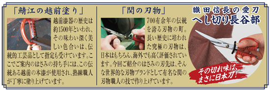 卓越した技と確かな品質でその名を広く知られる、「関の刃物」と「鯖江の越前塗り」による贅を尽くした日本刀はさみのご紹介です。なんと織田信長の愛刀「へし切り長谷部」がモチーフで、家紋の木瓜もあしらわれた逸品。刃の部分は、刃物の町として有名な岐阜県関市の刃物職人が、一本一本、丹精込めて作り上げているので切れ味抜群です。しかも、持ち手は手になじみやすい越前本漆仕上げで、福井県鯖江市の職人による本格的な手塗りが施され、独特の光沢は高級感に溢れています。今回は、インテリアとしてもご堪能いただけるよう、和室をイメージしたミニチュアの飾り台もご用意。季節に応じて背景写真が差し替えられ、内蔵のLEDライトを照らせば、大変趣きのある飾り物としてお楽しみいただけます。新年を祝う置物としてもおすすめですので、ぜひおすすめいたします。