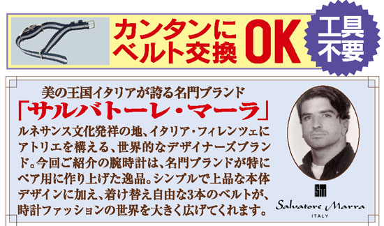お洒落に関心の高い方にとって手首を飾る時計は、大切なファッションの一部。装いやシーンに合わせ、着け替えを楽しみたいですね。そこでご紹介するのが、美の王国イタリアが誇る名門ブランド「サルバトーレ・マーラ」のベルトウォッチ。高級感あふれる牛革ベルトに加え、カジュアルなレザー通しベルト、若々しい布地のトナーベルトの3本が、工具なしで手軽に着け替えできます。本体も上品なデザインで、紳士用、婦人用ともゴールドとシルバーの2タイプをご用意。文字盤は視認性が高く、一目で時刻が分かります。ムーヴメントは高性能の日本製で、安心してお使いいただけます。紳士用、婦人用とも11,880円というお求めやすいお値段で、ペアでお求めになれば、なんと2万円ジャストと断然お得! ご夫婦ふたりペアウォッチでお出かけになれば、楽しさも倍増です。