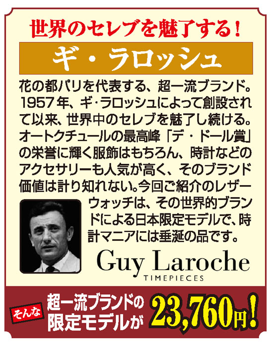 芸術の国フランスを代表する、パリの名門ブランド「ギ・ラロッシュ」から日本限定モデルが登場! 多くのメンズファッション誌で取り上げられ大好評を博している、時計好きには見逃せない逸品です。最大の特徴はスケルトンの文字盤で、浮き彫りになったローマ数字が立体感を醸す独創的なデザイン。ベルトはクロコ型押しの高級レザーを使用し、ケースのカラーは4色ご用意。ひときわ豪華なローズゴールドに、味わい深いブラックゴールド、上品なゴールドシルバーに、男の渋さを印象づけるブラックと、どれも目移りするほど魅力的です。機能的にもすぐれ、ムーヴメントは安心の日本製。生活防水で手を洗う時もいちいち外す必要はありません。風格あふれる腕時計は男の器量をアピールするもの。名門ブランドの逸品が、その役割を堂々と果たします。