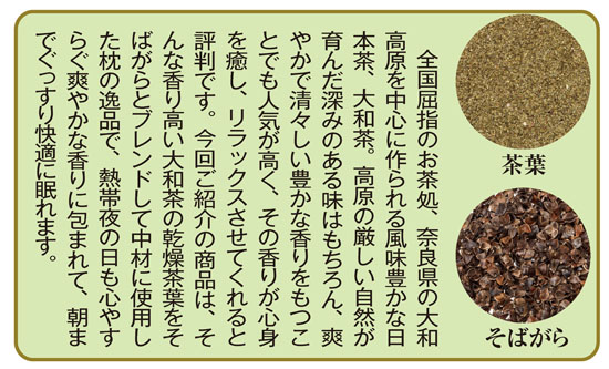 真夏の夜は頭がムレてなかなか寝つけない…。自分にぴったりの高さの枕が見つからない…。いつもの枕じゃリラックスできない…。そんな枕のお悩みをイッキに解消してくれる今再注目のそばがら枕のご紹介です。枕の中材に使用したのは上質な天然のそばがらで、熱を拡散して冷やす通気性と汗をしっかり吸い取る吸汗性に大変優れているのが特長。柔らかすぎず硬すぎない絶妙な弾力も心地よく、暑くても快適に眠れます。さらに、この枕の中材には、香り高い銘茶として知られる奈良県産大和茶を乾燥させた乾燥茶葉を贅沢に使用。爽やかなお茶の香りに心身ともに癒やされて、朝までぐっすり快適に眠れます。快眠の要、枕の高さ調節も簡単で、両脇のファスナーを開閉するだけで3段階調節が可能。頭の形にもフッイットする心地良さも魅力で、どなたでも安心して使えます。今回はうれしい2個組でのご提供ですので、ご夫婦で使い分けたり、お部屋に応じて使い分けたりする際に便利です。